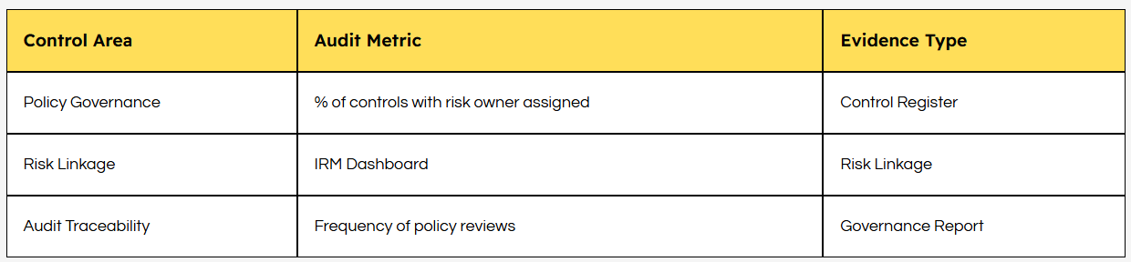 • Compliance Evidence: Documented control-to-risk mapping, policy lifecycle logs, and board-level risk heatmaps.