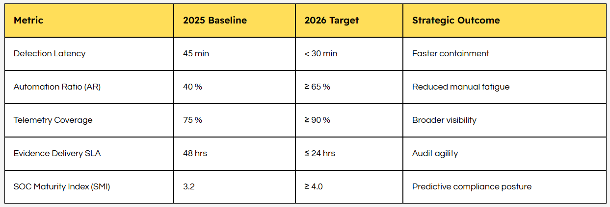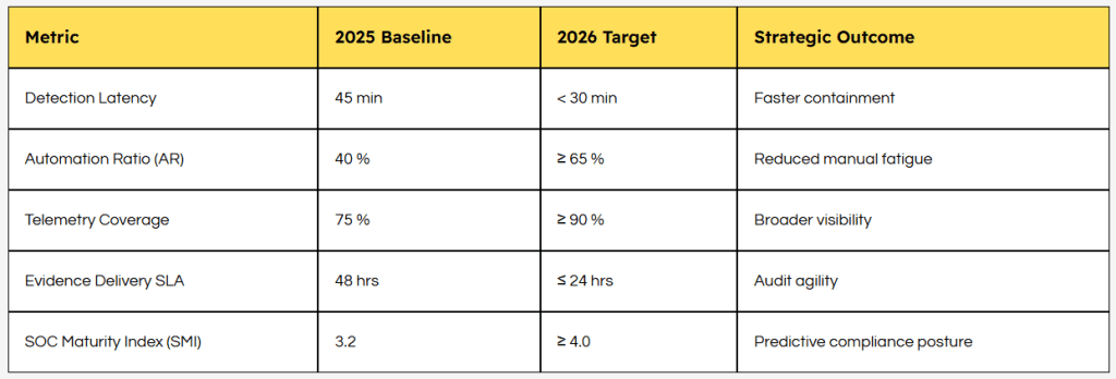 Traditional checklists are no longer enough. Enterprises need an integrated framework that ties detection performance, automation levels, and audit assurance to governance outcomes.